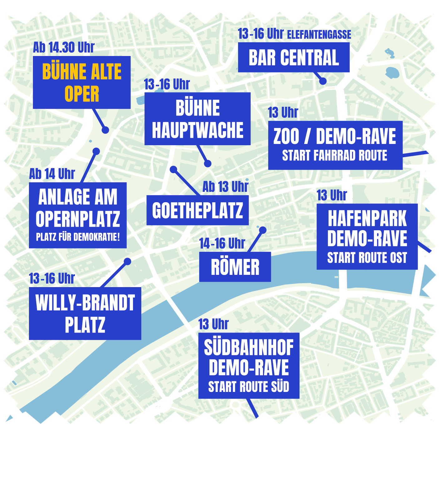 Ab 13.00 Uhr gibt es vielfältige Aktionsangebote der Bündnispartner*innen an Hauptwache, Willy-Brandt-Platz, Römer, Goetheplatz und Bar Central.